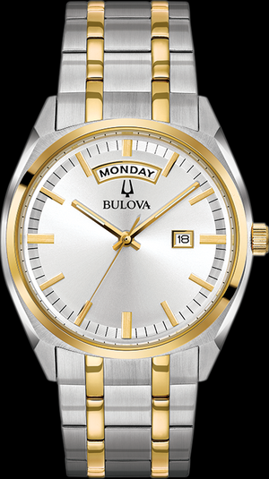 Two-tone gold stainless steel case with new day/date function, three hands, silver white dial with gold hands and indexes, domed mineral glass, and gold and stainless steel bracelet with double push-button clasp.