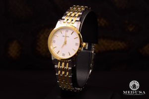 From the Classic Collection. Stainless steel with two-tone finish, 4 diamonds individually hand-set on a silver and white patterned dial, and a deployment clasp.