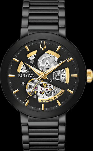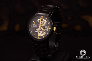 From the modern automatic collection. In black IP stainless steel, automatic movement with 40-hour power reserve and black open dial with gold accents, domed mineral glass, screw-down case, black IP stainless steel bracelet with double push-button clasp, and water resistance up to 30 meters.