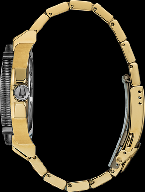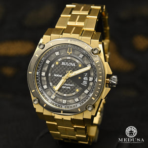 Powered by Bulova's exclusive Precisionist three-hand calendar movement with a vibration frequency of 262 kHz - eight times higher than standard timepieces - for unmatched accuracy. Gold-tone stainless steel case with black dial featuring 11 hand-set diamonds, curved mineral crystal, gold-tone stainless steel bracelet with sport-style clasp. Water resistant to 300 meters.