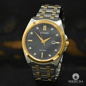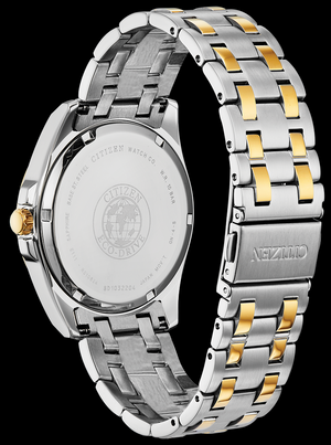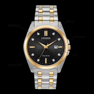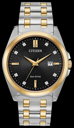 This CITIZEN® Corso collection offers timepieces enhanced with vibrant diamond indexes in a combination of functional simplicity with a touch of elegance. This timepiece, presented here in a two-tone stainless steel case and bracelet, adds an extra touch with the contrasting black dial. Equipped with our Eco-Drive technology – powered by light, any light. Never needs a battery.