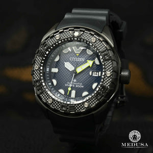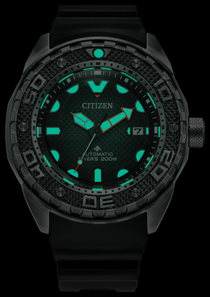 Dive into a new collection of automatic dive watches with a deep connection to Citizen's history of innovation and exclusive technology. The new Promaster Automatic Diver 200M watch features a Super Titanium™ case with Duratect DLC coating that is lightweight and durable. The bezel has angled tabs for easy grip, and both the bezel and dial feature a pyramid stud design surrounding a double-domed anti-reflective sapphire crystal, while the dark blue dial complements the titanium case and black polyurethane strap for a strong aesthetic of sport, style, and performance. Powered by your wrist's movement, this advanced automatic watch has a 42-hour power reserve and large luminous hands and markers to provide easy reading in darkness or underwater. It comes in an exclusive black collector's box, includes an extension strap, and complies with ISO standards with a screw-down crown and water resistance up to 200 meters. Caliber 9051.