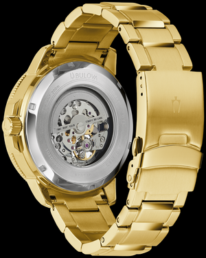The latest addition to the classic men's Marine Star Automatic watch collection features sporty elegance with a nautical appeal found in the details. The brushed gold stainless steel case is enhanced by the black 3-hand dial with a rotating bezel and an exhibition window that showcases the 21-jewel automatic movement to ensure optimal performance. The gold stainless steel bracelet has a sporty deployment clasp with pushers for easy access and a seamless look. This watch is water-resistant up to 200 meters and is the perfect look for elegant adventures on land and sea. Caliber: 8N26