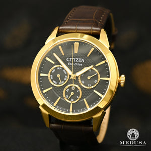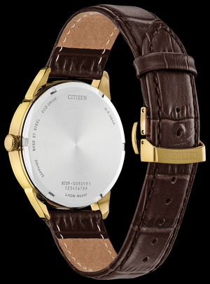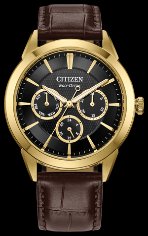 With its timeless style inspired by the classics, the brand new multifunction Rolan watch from Citizen takes the Classic collection to the next level. The 40 mm stainless steel case with gold tones perfectly matches the watch's black dial, which includes three subdials within a textured inner circle, enhancing its exquisite charm. Applied accents and a brown leather strap complete the aesthetic of this refined watch, which combines functionality with elegance through features such as 12/24 hour display and analog day and date indicators. Powered by light in all its forms, this watch equipped with our exclusive sustainable Eco-Drive technology never needs a battery. Water resistant up to 100 meters. Caliber number: 8729.