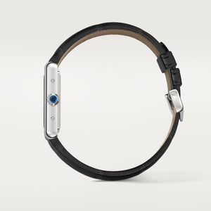 Tank Must watch, small model, quartz movement. Steel case, beaded crown adorned with a synthetic spinel cabochon, black lacquer dial, rhodium-plated sword-shaped hands, shiny black alligator strap, steel pin buckle. Case size: 29.5 x 22 mm, thickness: 6.6 mm. Water-resistant up to 3 bar (~30 meters).