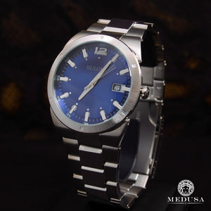 De la colección clásica. Fabricado en acero inoxidable con cristal abovedado, esfera azul rayo de sol de dos niveles, calendario, segundero, agujas e índices luminosos, rosca a rosca y hebilla desplegable de doble empuje.