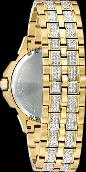 Caja de acero inoxidable dorado adornada con cristales Swarovski © 308 en el bisel, brazalete y esfera, movimiento multifunción, brazalete de acero inoxidable dorado con cierre desplegable y resistencia al agua hasta 30 metros.