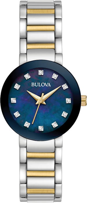 De la colección Futuro. En acero inoxidable y oro, 12 diamantes, engastados individualmente a mano en una esfera de nácar azul, un cristal mineral abovedado, un cristal metálico de borde a borde, un brazalete de acero inoxidable y un tono de oro rosa con cierre plegable.