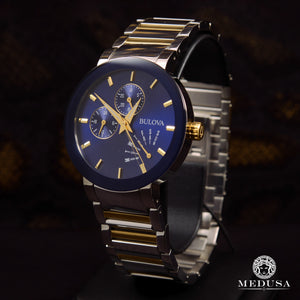 De la colección moderna. En acero inoxidable con acabados en plata y oro, esfera azul, cristal mineral abovedado, movimiento con seis funciones múltiples y cerradura de despliegue.