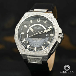 Defined by refinement and driven by innovation, this watch from the X series combines Bulova's most advanced technology with unmatched aesthetics. The striking case design features a silver stainless steel faceted construction, with a mix of polished and brushed finishes, a curved sapphire crystal with anti-reflective coating, as well as a bezel and bracelet adorned with 174 radiant 1mm diamonds hand-set totaling 0.83 carats. The captivating black dial has a brushed finish with silver hands and applied markers filled with luminescent material, a date window, and a seconds hand with a smooth sweep. A translucent opening in the dial offers a glimpse of Bulova's exclusive Precisionist movement, a revolutionary 8-jewel quartz mechanism accurate to 5 seconds per month and with increased resistance to temperature changes. The watch is water-resistant to 100 m and is paired with a black pearly crocodile grain leather strap with a push-button deployant clasp. Illustrating Bulova's ability to push boundaries, this watch is designed for the unexpected.