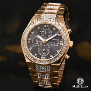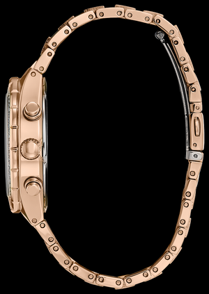 Aporta sofisticación a tu día con CITIZEN® Crystal. Este reloj cronógrafo atemporal muestra el tiempo de 12/24 horas y viene en una caja y brazalete de acero inoxidable en tono oro rosa adornados con cristales y una esfera negra. Con nuestra tecnología Eco-Drive, alimentada por luz, cualquier luz. Nunca necesitas una batería.