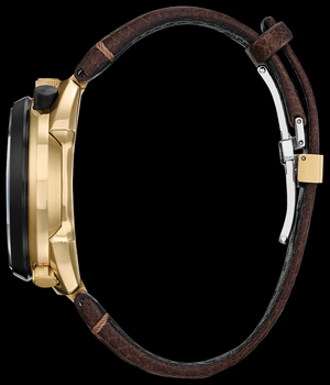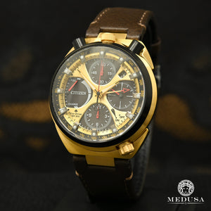 El Tsuno Chrono Racer Promaster 50th Anniversary Edition es un reloj de alto rendimiento con un diseño innegablemente distintivo. Inspirado en el reloj Citizen Bullhead original de 1973, este destacado cronógrafo presenta una caja de acero inoxidable de dos tonos de 45 mm sostenida por una elegante correa de cuero marrón. Con una esfera dorada, el diseño utiliza cuatro subesferas negras realzadas por agujas rojas para crear un efecto dinámico y deportivo. Este reloj ofrece el movimiento ensamblado a mano, un cronómetro de 1/5 de segundo con función flyback que puede medir hasta 12 horas, una alarma, un medidor de reserva de marcha y una ventana que muestra la fecha. Fiel a los estándares de robustez de la colección Promaster, este reloj es resistente al agua hasta 200 metros. Con la tecnología Eco-Drive exclusiva de Citizen, funciona con luz para un funcionamiento constante y duradero, sin baterías. Número de calibre: E210.