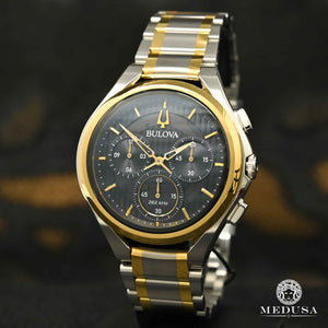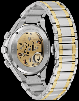 Combining unparalleled finesse with Bulova’s cutting-edge technology, this new 5-hand men's watch from Bulova redefines the avant-garde CURV collection. Equipped with the world's first curved movement, the watches in the CURV collection use a high-performance 262 kHz quartz technology, offering remarkable accuracy of 5 seconds per month. This new CURV model stands out with its silver and gold-tone stainless steel case enhanced by polished and brushed accents, topped with a curved sapphire crystal. Skeletonized, the elegant black striped dial offers a glimpse of the complex movement. Featuring stainless steel markers in gold tones and hands that contrast with the background, the dial includes three subdials displaying elapsed time in 12-hour, 60-minute, and 60-second intervals. The subdial at the 6 o'clock position serves as a 60-second chronograph and running seconds hand. The pusher located at the 4 o'clock position activates the dual time zone display. Fitted with a matching silver stainless steel bracelet with gold tones, this watch fastens with a deployant clasp with push buttons. Redefining the refined profile of the first model in the CURV collection, this new Bulova watch embodies elegance and sophistication, making it perfect for any occasion.