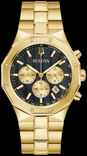 Ce chronographe à six aiguilles de la collection homme Classic Bulova Prestige se distingue par son design audacieux et moderne. Il est doté d'un boîtier facetté de 40 mm en acier inoxydable doré avec une lunette géométrique, d'un verre saphir plat traité antireflet, d'une étanchéité jusqu'à 100 mètres et d'un bracelet à trois maillons chanfreinés, alliant finitions brossées et polies, et d'une boucle déployante à bouton-poussoir. Le cadran noir texturé, orné d'élégantes rayures, présente des aiguilles et des index dorés avec revêtement luminescent Super-LumiNova, un guichet de date et des sous-cadrans dorés, dont un affichage 24 heures. Alliant haute fonctionnalité et design distinctif, ce garde-temps est idéal en toutes circonstances, du quotidien aux événements exceptionnels.