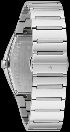 Caja de acero inoxidable distintiva asimétrica en forma de tonel con una firma azul Futuro de borde a borde en cristal metálico curvado con una esfera azul y brazalete de acero inoxidable. El reloj tiene un movimiento de cuarzo de tres manecillas, un cierre desplegable con pulsadores y resistencia al agua hasta 30 metros.