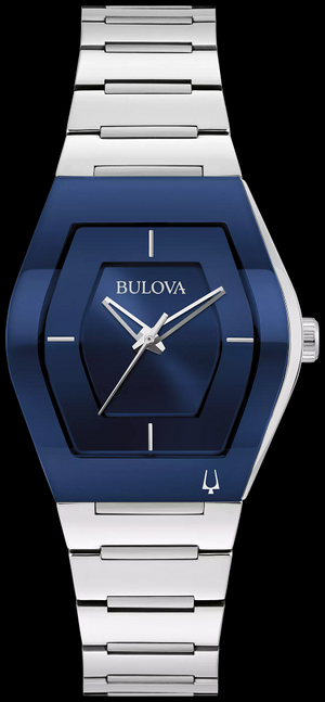 Caja de acero inoxidable distintiva asimétrica en forma de tonel con una firma azul Futuro de borde a borde en cristal metálico curvado con una esfera azul y brazalete de acero inoxidable. El reloj tiene un movimiento de cuarzo de tres manecillas, un cierre desplegable con pulsadores y resistencia al agua hasta 30 metros.