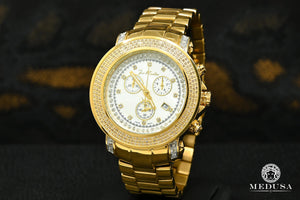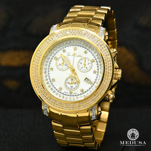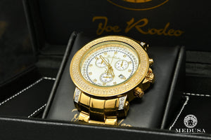 Este reloj Joe Rodeo está decorado con diamantes genuinos de alta calidad y viene con un movimiento cronógrafo SWISS completamente funcional, caja de acero inoxidable y fondo de acero inoxidable grabado y numerado individualmente. Resistente al agua hasta 100 m (330 pies). Este reloj de diamantes está garantizado como 100% nuevo y genuino y vendrá en su empaque de fabricación original con dos bandas adicionales y todos los documentos originales.