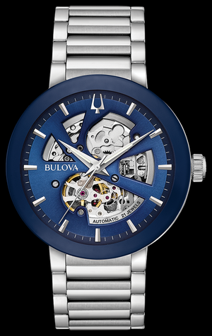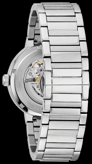 De la colección automática moderna. Fabricado en acero inoxidable, movimiento automático de cuerda automática con reserva de marcha de 40 horas y esfera negra de apertura abierta con detalles en oro, cristal mineral abovedado, caja a rosca, brazalete de acero inoxidable con cierre de doble presión y resistencia al agua hasta 30 metros.