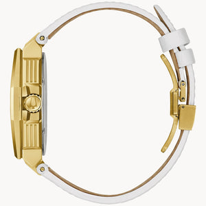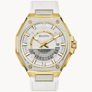 Este nuevo e impresionante reloj para hombre Precisionist X Diamond seguramente causará una impresión duradera. El diseño arquitectónico masculino de este extraordinario reloj está marcado por 174 diamantes engastados a mano, con un total de 0,83 quilates y engastados a mano en una caja de acero inoxidable en tono dorado y plateado. La esfera de calendario de 3 manecillas de color blanco plateado se detalla con una ventana de calendario de exhibición y está terminada con un cristal de zafiro curvo, lo que brinda un efecto sofisticado y pulido. El look se completa con una correa de cuero blanco con un cierre desplegable con pulsadores para abrirlo fácilmente. Este reloj de lujo es resistente al agua hasta 100 metros y funciona con el movimiento de calendario de 3 manecillas de 262 kHz de alto rendimiento exclusivo de Bulova. Lleva el estilo audaz al siguiente nivel con este innovador reloj, que combina diseño y tecnología.