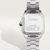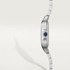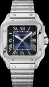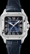 Reloj Santos de Cartier, modelo mediano, movimiento mecánico de carga automática 1847 MC. Caja de acero, corona de 7 lados adornada con una espinela azul sintética facetada, esfera azul degradada, agujas en forma de espada de acero pulido y material luminiscente, cristal de zafiro. Brazalete de acero con sistema de tallaje “Smartlink”. Segunda correa de aligátor azul con cierre desplegable de acero intercambiable. Ambas pulseras están equipadas con el sistema de intercambiabilidad "QuickSwitch". Ancho de la caja: 35,1 mm, espesor: 8,83 mm. Resistente al agua hasta 10 bares (~100 metros).