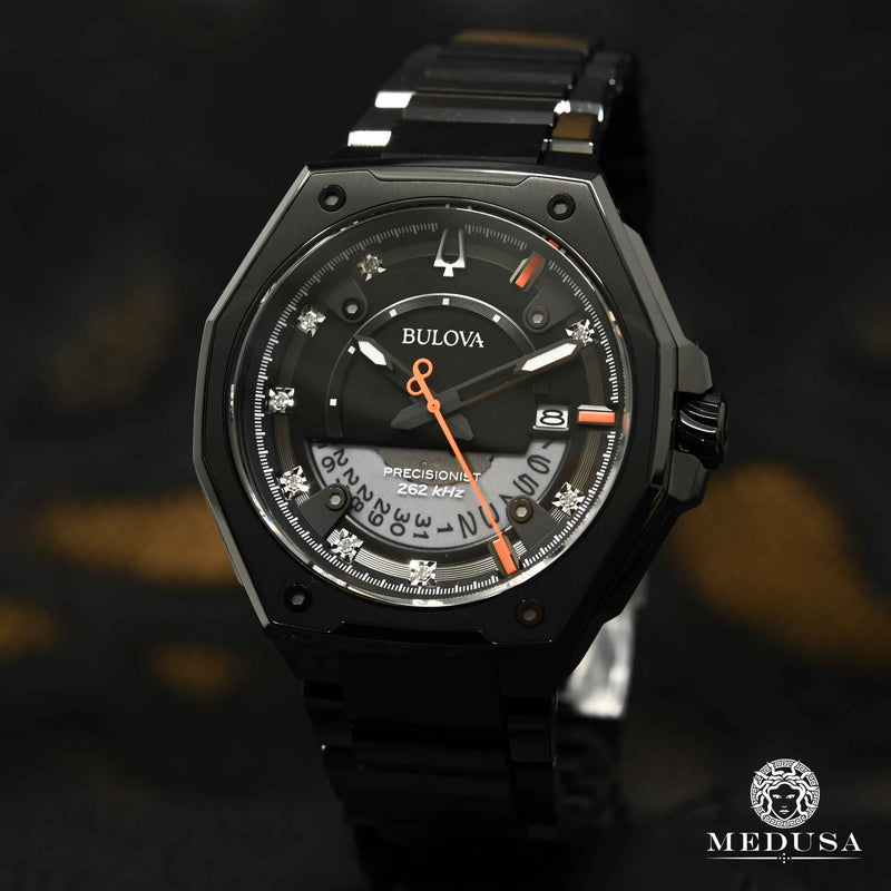 Bulova launches the new watch from the Marc Anthony Series X, the result of its bold collaboration with the eponymous singer, one of the most influential personalities in the music scene of all time. Combining Bulova's renowned fine watchmaking with Marc Anthony's artistic inspiration, this exclusive watch with a diamond-studded dial reflects the shared passion for music as well as the performer's penchant for luxury and unique style. The iconic black ion-plated stainless steel case with facets features polished and brushed finishes, mirroring the lively rhythms of Marc Anthony. The beautiful black brushed dial adorned with diamonds houses a date indicator and a bright orange seconds hand matching the markers of the same color at the 1, 3, and 5 o'clock positions, which hold special significance to the singer. Eight hand-set diamonds decorate each of the other markers, all crowned by Bulova's famous tuning fork at the 12 o'clock position. In short, the nuanced tones of the dial evoke the subtleties of the artist's musical style. Additionally, the openwork part of the dial reveals Bulova's Precisionist quartz movement, a revolutionary mechanism with eight jewels offering an accuracy of five seconds per month and increased resistance to temperature variations. The back of the case features a unique glass bezel bearing the quote: "For those who know." A black ion-plated stainless steel bracelet attaching with a deployant push-button clasp perfectly matches the case decorated with Marc Anthony's signature. Water-resistant up to 100 m and covered with a curved anti-reflective sapphire crystal, the high-performance Series X Marc Anthony watch with refined aesthetics embodies both the timelessness of Marc Anthony's musical work and Bulova's motto Bold at heart and will therefore never go out of style.