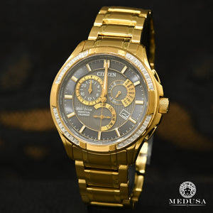 Add sophistication to your look with the Diamond 8700. Featuring a grey dial and a gold stainless steel bracelet, this watch offers timeless charm with advanced functions including a perpetual calendar, alarm, dual time, and water resistance up to 100 meters. Completed by a 42 mm gold stainless steel case and bezel adorned with 32 diamonds. Sustainably powered by any light thanks to Eco-Drive technology - never needs a battery.