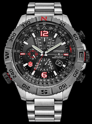 Snowbirds is the name we give to the air demonstration squadron made up of military ambassadors of the Canadian Armed Forces (CAF); these pilots demonstrate high-level skills, professionalism, teamwork, discipline, and devotion, fundamental qualities of the men and women of the country's military organization. Reflecting the Snowbirds squadron, the CITIZEN® Promaster Snowbirds Navihawk watch offers a superior degree of precision thanks to its atomic timekeeping displaying the time in 26 time zones. Inspired by the view of a pilot in flight, this luxury watch features a gray dial with red accents housing luminous hands and markers, paired with a stainless steel bracelet. Its raised design ensures increased comfort. This model has many features, including a chronometer, a perpetual calendar, a power reserve indicator, an adjustable scale, and a rotating bezel with a compass. Additionally, it is fully powered by light thanks to CITIZEN's exclusive Eco-Drive technology. Whether you stay on the ground or aspire to conquer the skies, this multifunctional watch will accompany you when you take off.