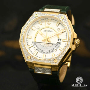 Defined by refinement and driven by innovation, this watch from the X series combines Bulova's most advanced technology with a truly luxurious design. The distinctive case design features a faceted gold-tone stainless steel construction, with a mix of polished and brushed finishes, a curved sapphire crystal with anti-reflective coating, as well as a bezel and bracelet adorned with 174 hand-set 1 mm diamonds totaling 0.83 ctw. The striking dial has a brushed silver finish with gold-tone hands and applied markers with luminous filling, a date window, and a seconds hand with a smooth sweep. A translucent opening in the dial offers a glimpse of Bulova's exclusive Precisionist movement, a revolutionary 8-jewel quartz mechanism accurate to 5 seconds per month and with increased resistance to temperature changes. The watch is water-resistant to 100 m and is paired with a bold dark green crocodile-grain leather strap with a push-button deployant clasp. An instant classic, this Bulova watch offers distinguished elegance in every setting.