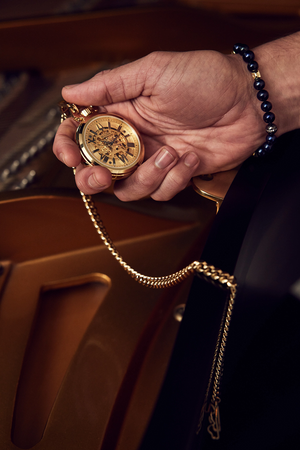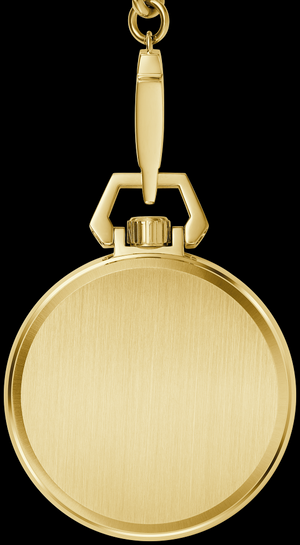The new Bulova Sutton pocket watch lets you discover the foundations of American watchmaking, when American watchmakers like Joseph Bulova were at the forefront of timekeeping and pocket watches were the norm. The sophisticated polished gold-tone stainless steel case features a mineral crystal and a winding crown protected by a knot that adds a modern touch to this classic silhouette. The gold dial has silver Roman numerals and hands, with a central opening that offers a view of the watch's internal workings. The skeleton automatic movement powering the watch has 21 jewels and a 42-hour power reserve. The historic look is completed by a 15-inch gold-tone stainless steel chain ending in a tuning fork-shaped spring clip for secure attachment. A modern reinterpretation of an American classic, the Bulova Sutton pocket watch carries its owner with classic refinement. Caliber: 8N24