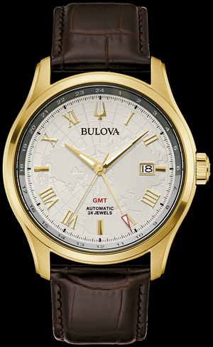 Timeless elegance is effortlessly combined with advanced GMT functionality in the new luxurious Wilton Automatic watch from the Bulova Classic collection. This traditionally styled watch features a new innovative automatic movement with the ability to easily set the hour hand to another time zone without affecting accuracy when traveling anywhere in the world – and the dual time can be read at a glance. The sophisticated design of the gold-tone stainless steel case presents a bright silver-white 4-hand GMT dial with a calendar, Roman numeral indexes, and a domed anti-reflective sapphire crystal. The luminous tip of the GMT hand is edged in a tone matching the "GMT" printed on the dial and works with the bi-color 24-hour dial ring to mark the 2nd time zone. The dial features a world map with the land area embossed in a CD groove texture with latitude and longitude coordinates also embossed above the sea. The brown embossed alligator leather strap with tone-on-tone stitching, a nubuck lining, and a double-press deployant buckle completes the richly elegant atmosphere. The 24-jewel automatic movement of this watch guarantees optimal performance and has a 42-hour power reserve, making it the ultimate watch for world travelers and high watchmaking enthusiasts. Water resistant up to 30 meters.