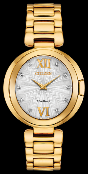 CITIZEN® reaches a new modern standard with its Capella collection. Elegant curves, seamless aesthetics, and technical expertise are all highlighted by the original watches in this collection. Diamond model shown with a stainless steel case and bracelet in gold tones and a silver dial with an integrated crown, creating a harmonious structure. Equipped with CITIZEN's Eco-Drive technology and powered by light in all its forms. Never needs a battery.