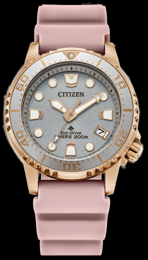 Dive into the latest Dive watch to join Citizen's innovative Promaster range. The new watch features a smaller and versatile 36.5mm case with a rose gold-colored stainless steel exterior, an easy-to-grip dive bezel, and a screw-down crown at 4 o'clock, the bold design secured to the wrist via a soft pink polyurethane strap. The striking white dial includes oversized hands and applied markers that enhance its high legibility, while rose gold-tone accents and a bright luminous material ensure an elegant style and quick readability, even in the deepest depths. At the 4 o'clock position is a well-thought-out date window, adding another element of functionality to this versatile diver. True to the robust standards of the Promaster collection, the watch is water-resistant up to 200 meters. Powered by Citizen's exclusive Eco-Drive technology to provide continuous and sustainable luminous vitality without ever needing a battery. Caliber E168.